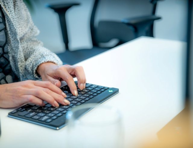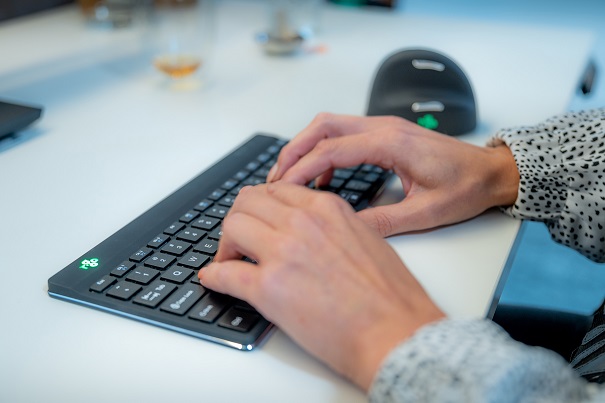The keyboard is thin and has a light keystroke, which creates a flat position for the wrists and reduces muscle tension. You can easily carry the Ergo Compact Keyboard around, making it ideal for the new flexible way of working.